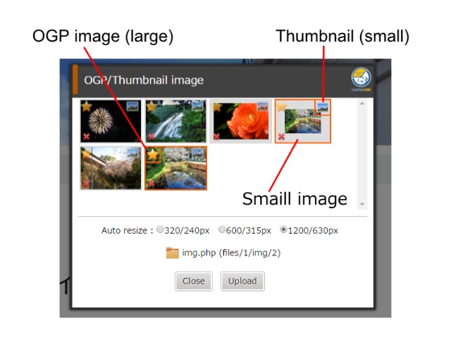 システムメニューのサムネイル設定ダイアログや、その他の画像アップローダーでのサムネイル画像の左上、右上にそれぞれOGPイメージとサムネイル設定ボタンがあります