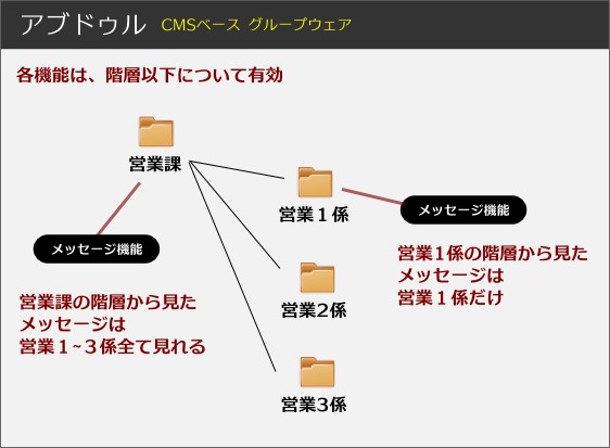 例えば、庶務課とか営業課等、課ごとのフォルダを先に作り、そこに後で課専用のメッセージボックス等、機能をフォルダに付加して使用します