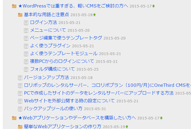 通常のフォルダプラグインは、下位ページを一段階だけ一覧表示するだけのプラグインですが拡張フォルダテンプレートモジュールでは、すべての階層をツリー表示することができ、更にドラッグアンドドロップで表示順とツリー間の移動を行えるようになっています
