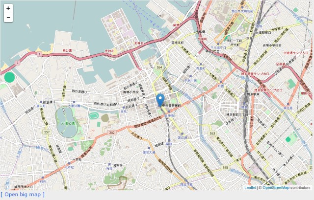 Googleマップインナーページプラグインをページに追加後、オープンストリートマップテンプレートモジュールを適用すると、Google マップがオープンストリートマップに置き換わります